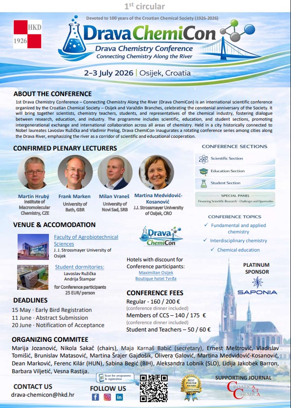 s velikim zadovoljstvom pozivamo Vas na 1. Drava Chemistry Conference – Drava ChemiCon 2026, koja će se održati 2. i 3. srpnja 2026. godine u Osijeku.