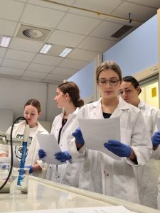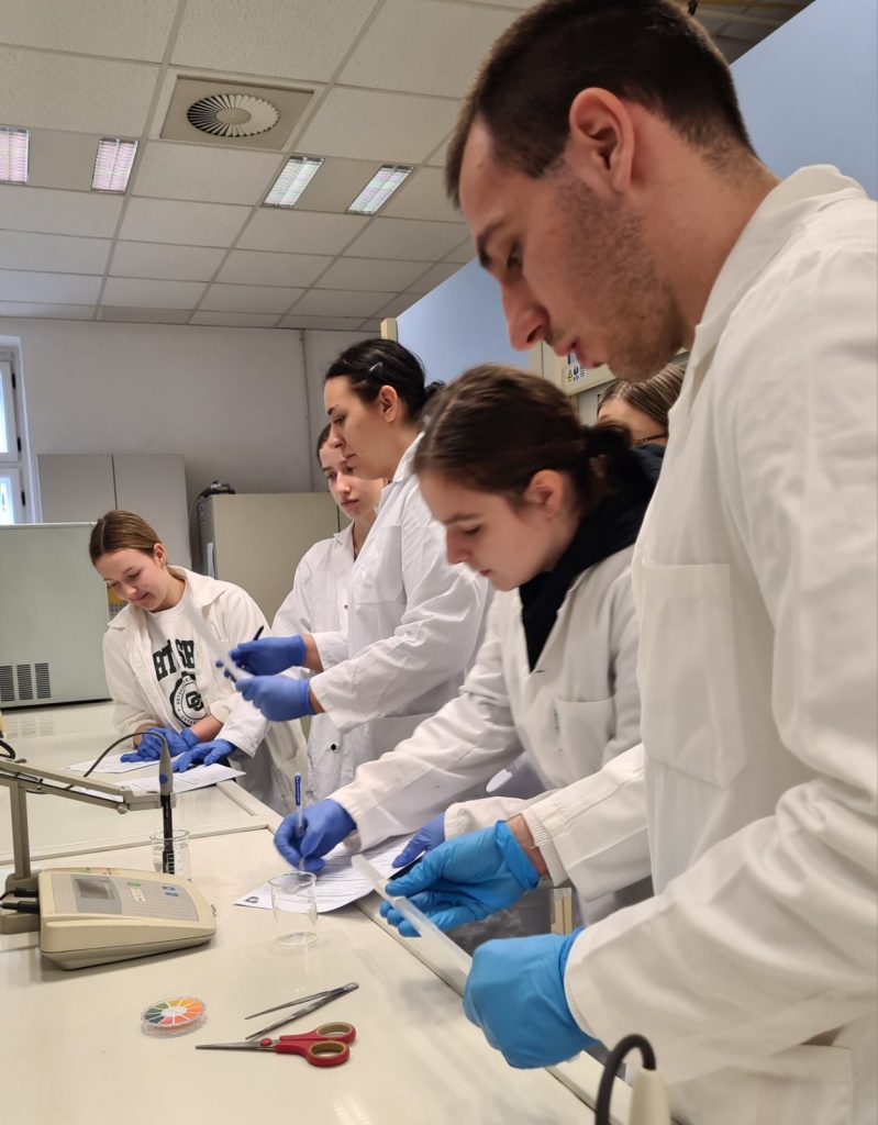 U četvrtak, 29. siječnja, u laboratoriju Odjela za kemiju Sveučilišta u Osijeku održana je još jedna zanimljiva i edukativna radionica u sklopu naše dugogodišnje suradnje s Gimnazijom Vukovar. Naše gošće, pod vodstvom prof. Antonije Milić, imale su priliku ući u svijet balneoloških istraživanja. Uz pomoć izv. prof. dr. sc. Elvire Kovač-Andrić, dr. sc. Nikoline Filipović i mag. chem. Stjepana Šarića, učenice su analizirale uzorke vode iz vukovarskih geotermalnih izvora. Detaljno su napravile fizikalno-kemijska analizu: od određivanja pH vrijednosti i električne vodljivosti do analize kationa kalcija i magnezija te aniona klorida. Kroz praktične vježbe bojanja plamena i određivanja tvrdoće vode, učenice su istraživale jedinstveni hidrogeološki sustav našeg kraja. Ovakav pristup ne samo da razvija praktične laboratorijske vještine i znanstvenu pismenost, već potiče i učenike da prepoznaju važnost prirodnih resursa u svom neposrednom okruženju. Ponosni smo na naše mlade kemičarke!
